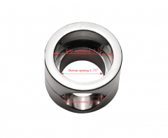Measurements: Length: 1.5 inches; Outer diameter: 2.25 inches; Inner diameter: top opening 1.3 inches, bottom opening 1.5 inches; Scrotum opening: 1.25 inches in diameter.